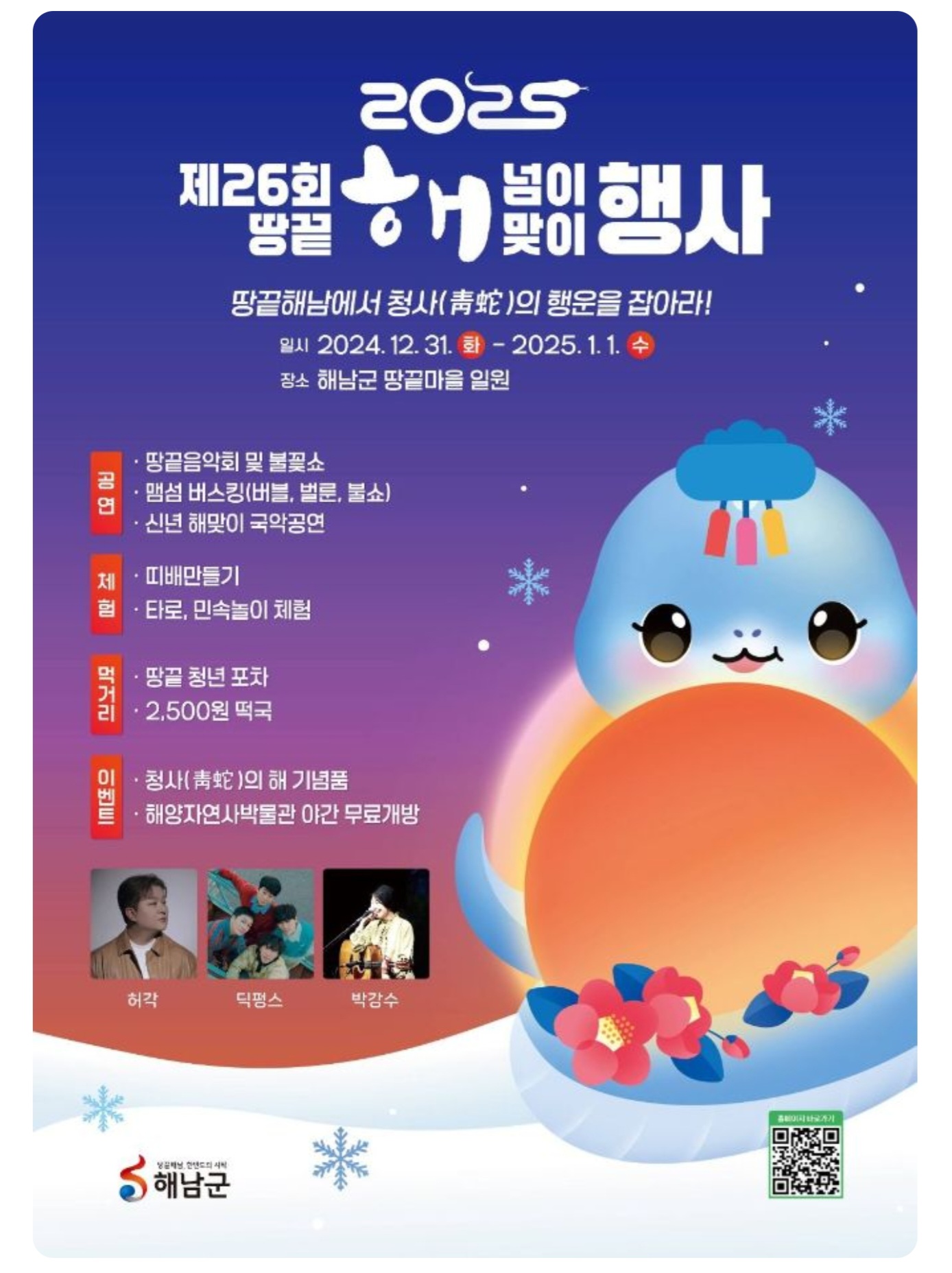 ◾️주요 프로그램: 땅끝음악회, 맴섬버스킹, 불꽃쇼, 대북공연, 희망의 띠배만들기, 신년운세체험, 땅끝청년포차, 2,500원떡국 등