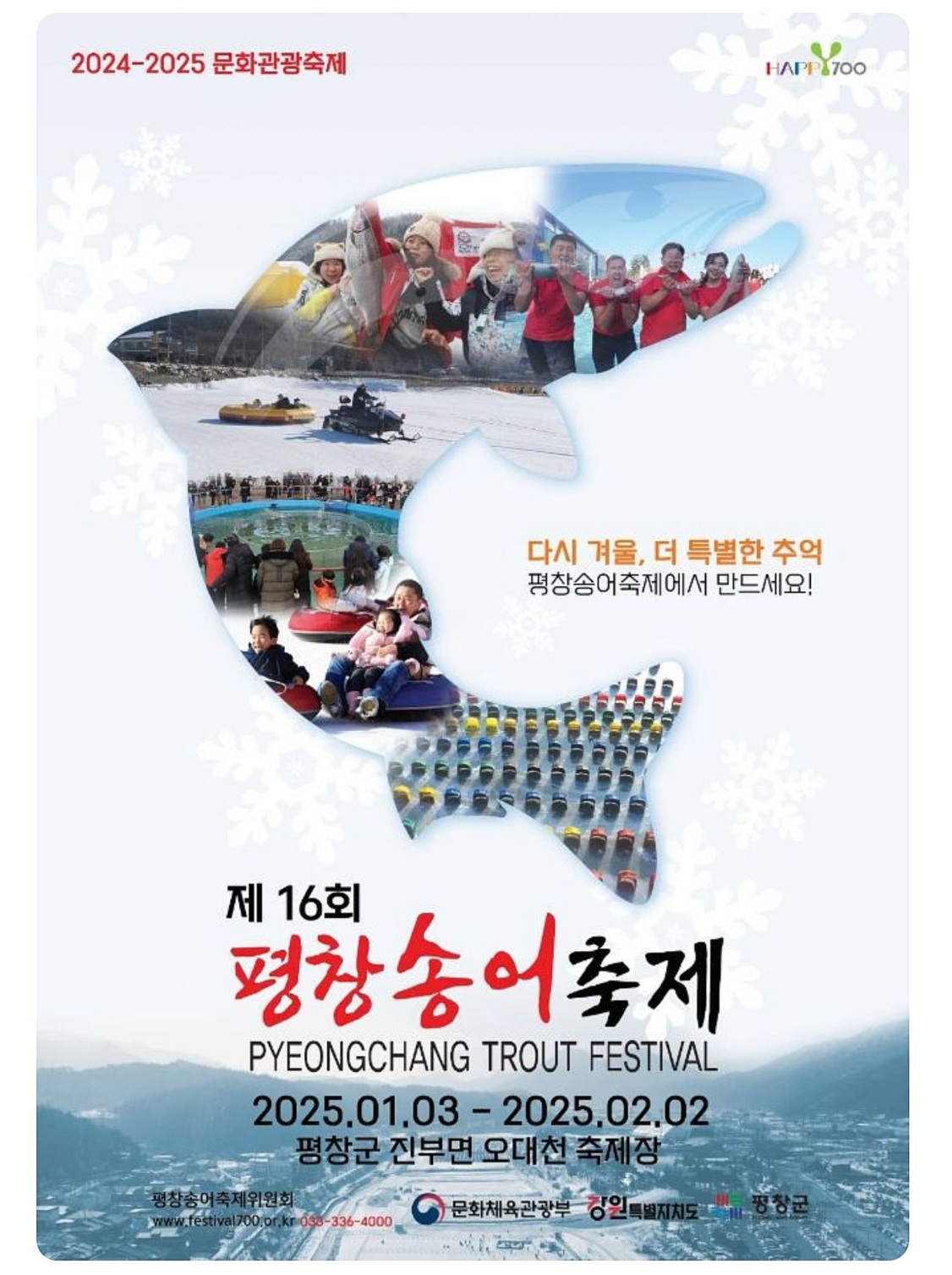 평창송어축제는 대한민국 강원도 평창군 진부면 오대천에서 열리는 대표적인 겨울 축제 중 하나로, 약 20년간 지역의 전통과 자연을 활용한 관광 명소로 자리 잡아 왔습니다. 이 축제는 강원도의 추운 겨울을 즐기는 독특한 방법을 제공하며, 가족, 친구, 연인 등 다양한 사람들이 함께 겨울 낚시와 놀이를 체험할 수 있는 기회를 제공합니다.