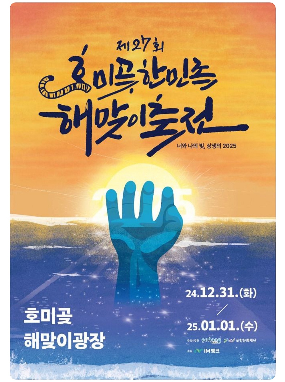 호미곶한민족해맞이축전은 한반도에서 해가 가장 먼저 뜨는 호미곶에서 매년 개최되는 해맞이축제입니다. 한반도의 최동단에 위치한 경상북도 포항시 남구 호미곶면에서 매년 12월 31일부터 1월 1일까지 개최되는 대표적인 해맞이 축제입니다. 이 축제는 1999년 새해를 시작으로 다양한 프로그램과 함께 진행되고 있습니다.